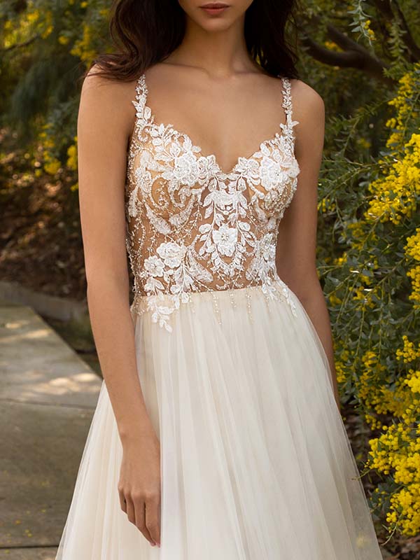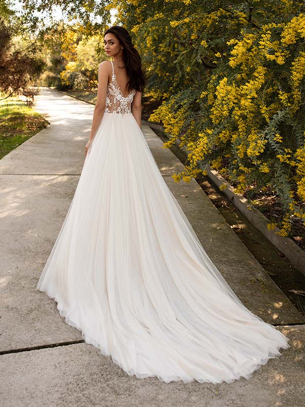 Entre la jupe en tulle très léger et hyper vaporeuse (très robe de princesse du coup), son bustier semi-transparent orné de broderies en pierres fines, et son décolleté sexy en V dans le dos, on adore cette robe si féminine et pas du tout too much !